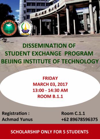 Student exchange merupakan program yang diadakan untuk mengedukasi mahasiswa-mahasiswa tentang dunia Internasional dengan belajar di Perguruan tinggi luar negeri. BIT Student Exchange adalah salah satu dari program kerjasama STIKI Malang dengan Beijing Institute of Technology (BIT) untuk mengenalkan dunia Internasional ke mahasiswa STIKI Malang. Mahasiswa berkesempatan untuk belajar di Beijing Institute of Technology (BIT) China selama 1 semester atau 1 tahun. Selain itu, Beijing Institute of Technology (BIT) menyediakan beasiswa bagi 5 mahasiswa yang mengikuti program Student Exchange. Menindaklanjuti hal tersebut Kantor Urusan Internasional (KUI) Malang mendakan Sosialisasi Student Exchange ke Beijing Institute of Technology (BIT) yang akan diadakan: